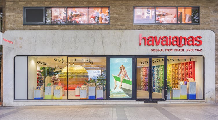 Pour acheter ou seulement rêver devant les images projetées en boucle de la plage de Copacabana située en bas de favelas que l’on ne voit pas. Un parfait résumé de la dualité de la tong.